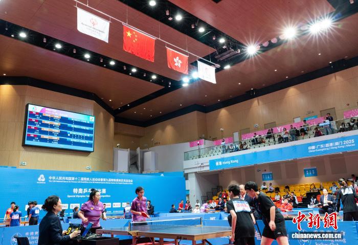 12月6日,第十二届全国残疾人运动会暨第九届特奥(残奥)乒乓球比赛在香港荃湾体育馆开幕。图为香港队郑启贞/刘静怡(紫色)对阵上海队的女双比赛。图片提供:华报记者侯宇。
